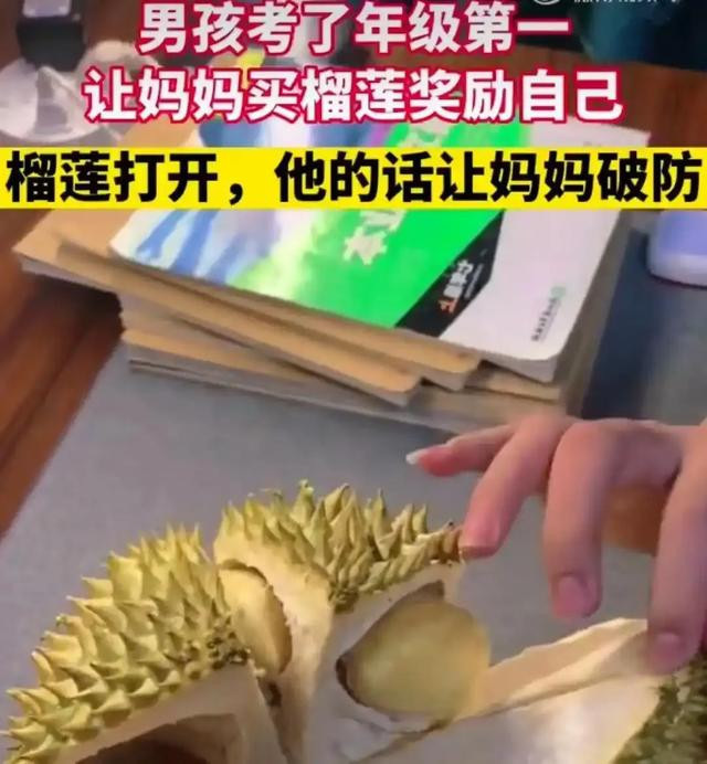 于是妈妈为了奖励他的进步,直接给他买了一个榴莲作为奖励。
